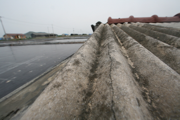 <사진, 전북부안의 한 염전, 깨지고 조각난 석면슬레이트 해주창고 지붕>
