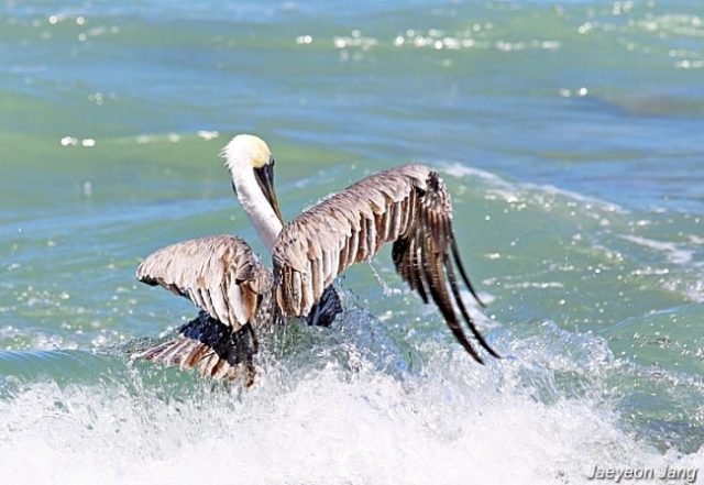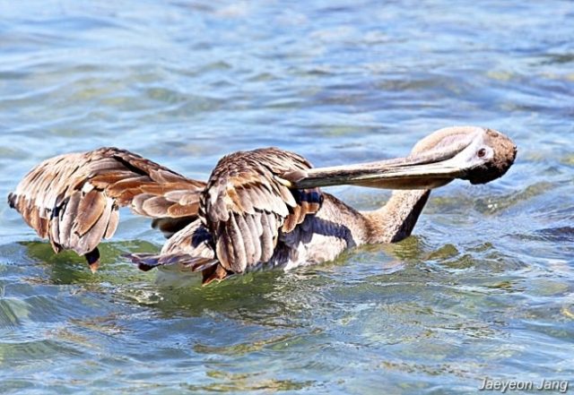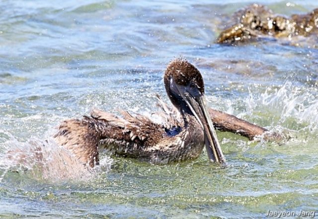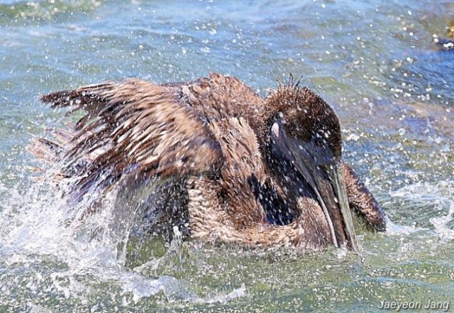 펠리컨도 물속에서는 육지에서의 둔했던 모습은 찾아볼 수 없고, 혼자 또는 여럿이서 함께 정말 잘 논다. 가끔은 몸에 묻은 뭔가를 털어내려는 듯 격렬하게 움직인다.
