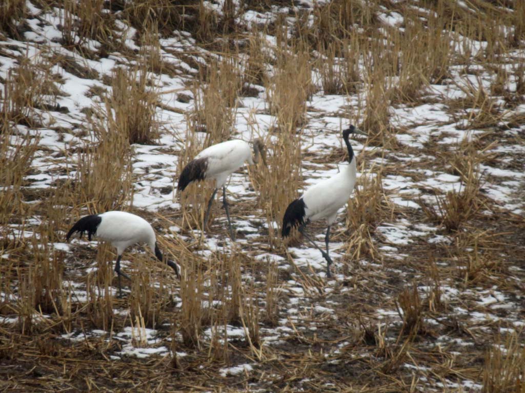 1워 23일 오후. 경기도 연천군 횡산리 임진강 주변 율무밭에는 두루미 한 가족이 한가로히 먹이를 먹고 있었다. 군남홍수조절지가 들어서기 전에는 흔히 볼수 있었던 모습이였으나, 댐 담수이후 한국수자원공사와 연천군에서 먹이터를 만들어 주기적으로 공급한 뒤부터는 밭에서 먹는 모습은 보기드문 광경이 되었다.