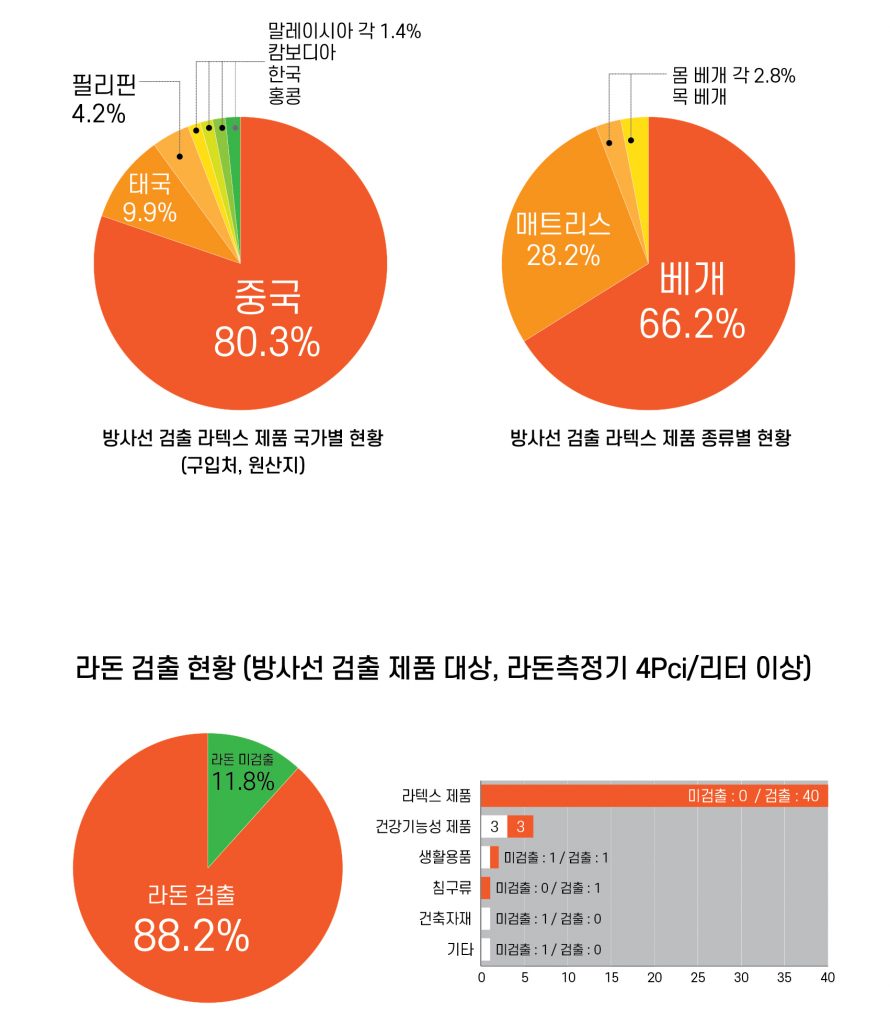 ▪ 감마선, 베타선, 라돈 등이 검출된 라텍스 제품의 원산지와 구입 장소는 중국(57건), 태국(7건), 필리핀(3건), 말레이시아, 캄보디아, 한국, 홍콩이 각 1건인 것으로 조사됨. 또한 매트리스와 베개류에서는 방사선이 검출되었지만, 같은 곳에서 산 라텍스 이불과 패드 등에서는 방사선이 검출되지 않음.
