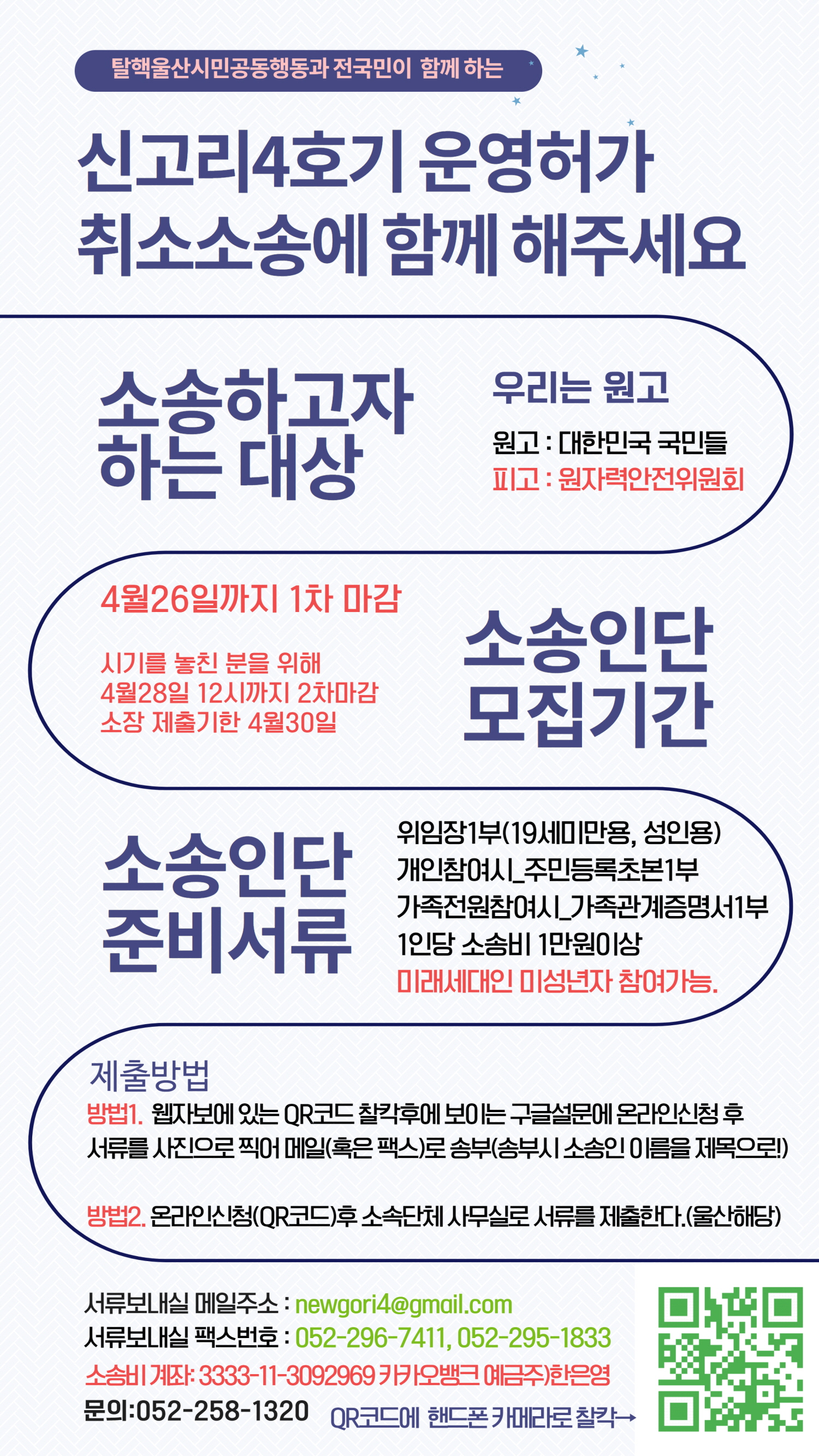 신고리 4호기 운영허가 취소 소송의 공동소송인단 참여와 법률비용 모금에 동참에 주시길 바랍니다.