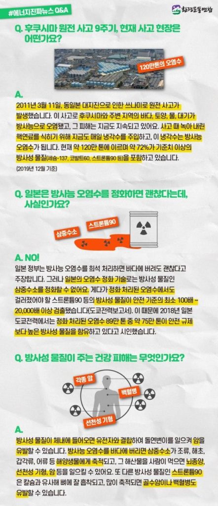 – 2011년 3월 11일, 동일본 대지진으로 인한 쓰나미로 원전 사고가 발생했습니다. 이 사고로 후쿠시마와 주변 지역의 바다, 토양, 물, 대기가 방사능으로 오염됐고, 그 피해는 지금도 지속되고 있어요. 사고 때 녹아내린 핵연료를 식히기 위해 지금도 매일 냉각수를 주입하고, 이 냉각수는 방사능 오염수가 됩니다. 현재 약 120만 톤에 이르며 약 72%가 기준치 이상의 방사성 물질(세슘-137, 코발트60, 스트론튬90 등)을 포함하고 있습니다. (2019년 12월 기준)