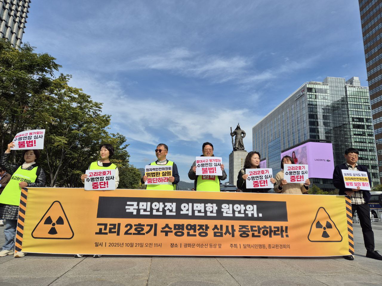 - 오는 10월 23일 열릴 제223회 원자력안전위원회(이하 원안위) 회의를 앞두고, 전국 시민사회연대체인 탈핵시민행동과 종교환경회의가 금일일 기자회견을 열어 이를 강력히 규탄했다. 이번 회의에서는 고리2호기 계속운전(수명연장) 허가 안건과 사고관리계획서 승인 안건이 지난 222회 회의에 이어 다시 상정될 예정이며, 관련 심사는 △중대사고 시나리오 배제 △확률론적 안전성 평가 축소 △국제 기준 불이행 △경제성 상실 △기후위기 대응 부재 등 여러 측면에서 불법‧부당한 절차적 결함을 안고 있다는 비판이 제기되고 있다. 그럼에도 정부와 한국수력원자력은 수명연장 절차를 강행하고 있으며, 규제기관인 원안위마저 마치 ‘원전 사업 추진자’의 역할을 자임하듯 편향된 태도를 보이고 있어 사회적 논란이 커지고 있다. 이에 따라 전국 각지에서 규탄의 목소리가 이어지고 있다. 지난 16일 경주를 시작으로 21일 경남·광주·울산, 대전, 22일 전북 등지에서 릴레이 기자회견이 열렸으며, 오늘 서울 기자회견은 그 마지막 일정이다. 금일 기자회견 참가자들은 “노후 핵발전소의 수명연장 추진은 안전을 위협하고 기후위기 대응에 역행한다”며, 고리2호기 수명연장 심사의 즉각 중단과 모든 노후 핵발전소의 폐쇄를 강력히 촉구했다.