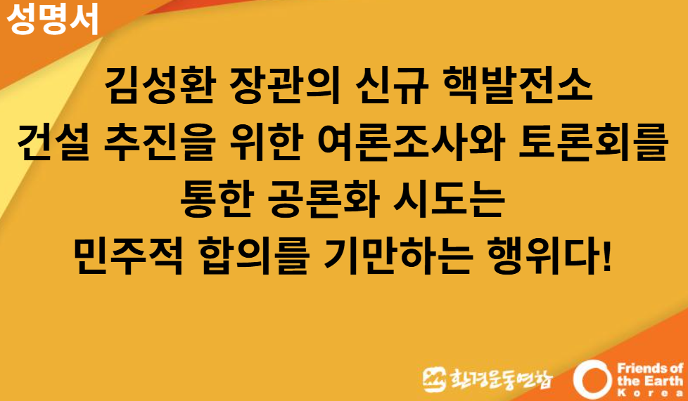 김성환 기후에너지부 장관이 '제12차 전력수급기본계획' 총괄위원회에 참석하여 제11차 전력수급기본계획(전기본)에 포함된 신규 핵발전소 2기 건설 추진 여부를 국민 여론조사와 대국민 토론회 등을 거치는 공론화 절차를 검토하겠다고 밝혔다. 이는 대한민국 미래 에너지 정책의 안정성과 민주적 정당성을 심각하게 훼손하는 시도이다. 이에 우리는 이재명 정부가 이러한 왜곡된 공론화 추진을 즉각 중단하고 탈핵·에너지전환의 원칙을 재확인하기를 강력히 촉구한다.