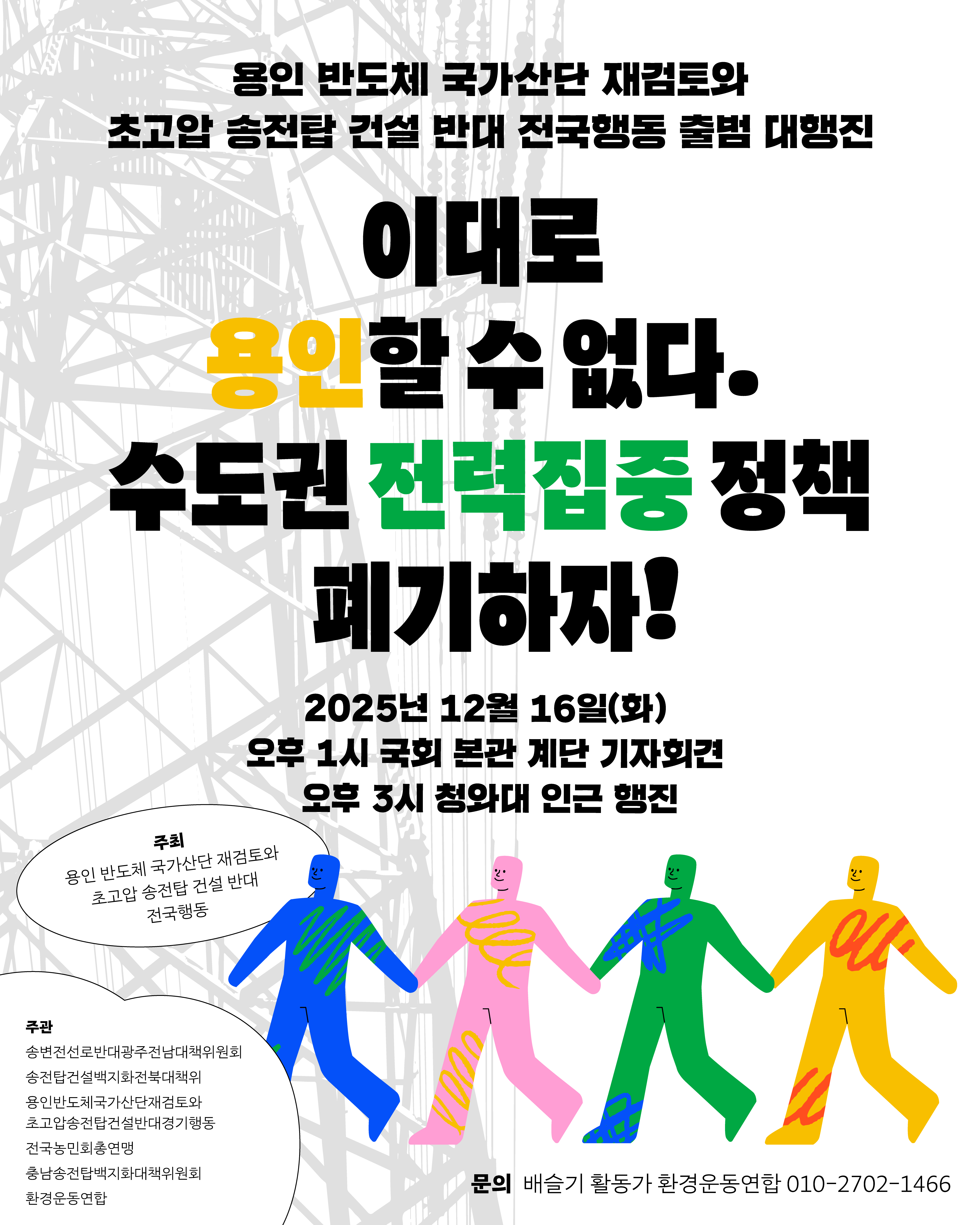 전국에 송전탑 건설로 용인 반도체 국가산단 재검토와 수도권의 전력수요 분산, 에너지전환과 지역균형발전을 위해 환경운동연합과 충남•광주•전남•전북•대전•경기의 시민들은 '용인 반도체 국가산단 재검토와 초고압 송전탑 건설 반대 전국행동'으로 함께 모였습니다. 에너지정의를 위한 첫 걸음, 출범식에 많은 참여 바랍니다.