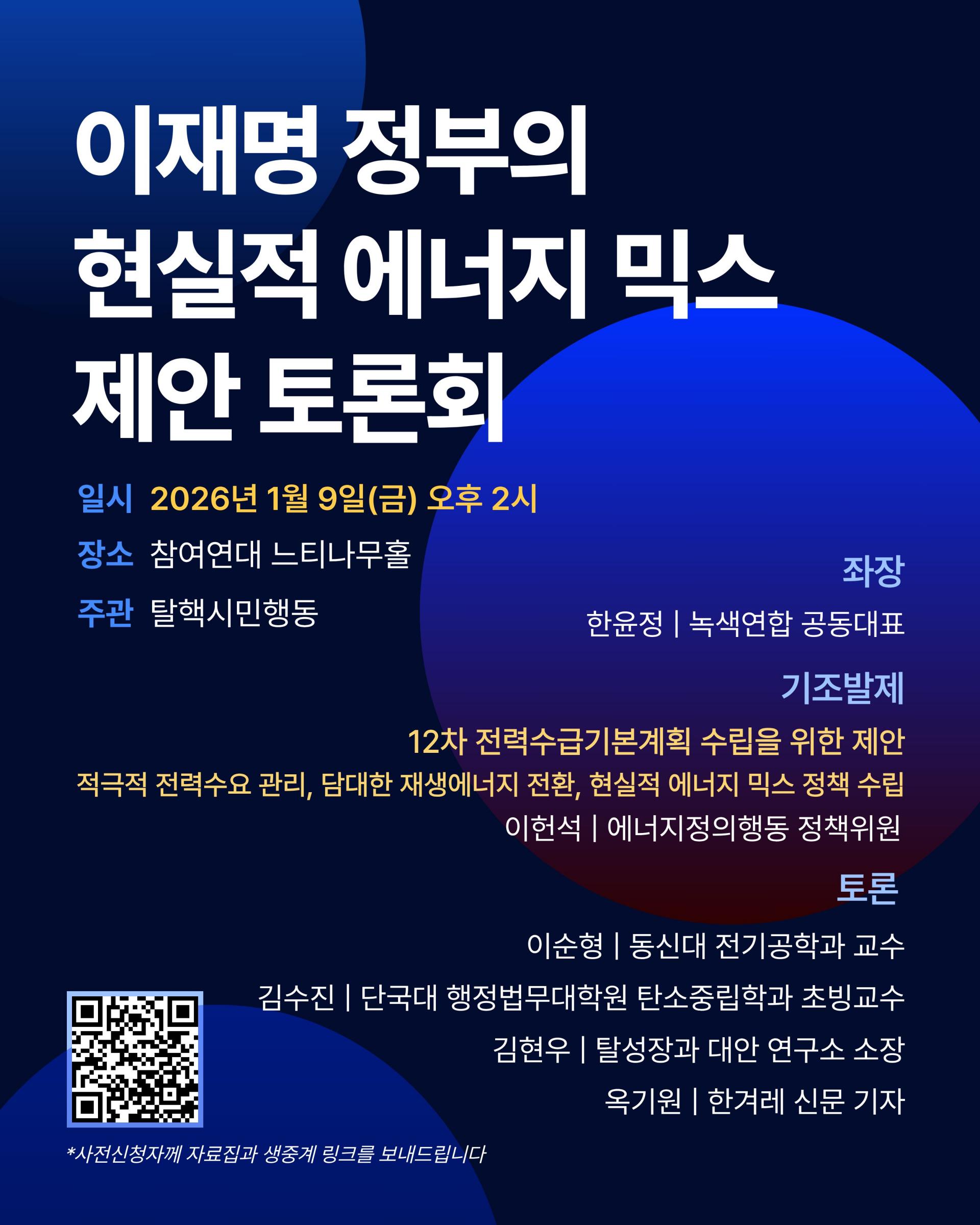 - 이에 탈핵시민행동 등 시민사회단체들은 형식적 공론화가 아닌, 기후위기 대응과 정의로운 에너지전환의 원칙에 기반한 바람직하고 현실적인 에너지 믹스가 무엇인지 시민의 관점에서 토론하고, 정부가 나아가야 할 책임 있는 정책 방향을 제시하고자 합니다.