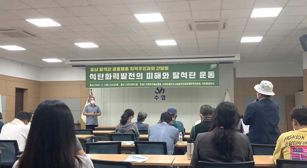 기자회견 이후 인근 수협에서 홍원마을 주민간담회가 열렸다. 홍원마을은 석탄발전소에서 뿜어져 나오는 미세먼지로 인한 건강 문제와 초고압 송전선이 마을을 관통하는 문제로 직접적인 피해가 우려되는 지역이다. 이미 서천화력발전소 가동이 시작된 1983년부터 30년 이상 석탄발전소로 인한 직간접적인 피해를 감내해야 했던 경험을 안고 있다. 이날 간담회 자리에는 신서천발전소의 가동으로 이와 같은 문제가 심화될 것을 염려하는 주민들이 한자리에 모여 각 피해 내용을 공유하고 해결책을 모색했다.