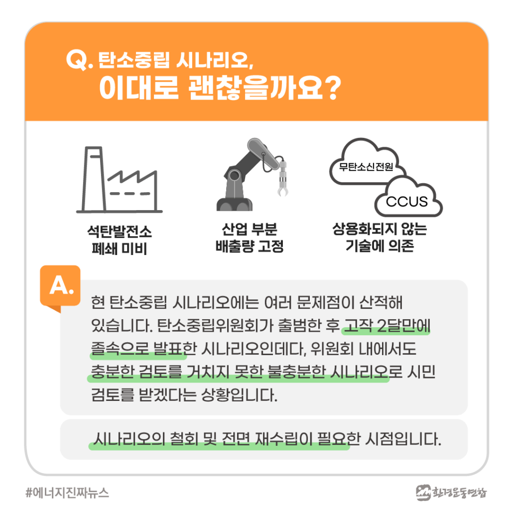 A. 현 탄소중립 시나리오에는 여러 문제점이 산적해 있습니다. 탄소중립위원회가 출범한 후 고작 2달만에 졸속으로 발표한 시나리오인데다, 위원회 내에서도 충분한 검토를 거치지 못한 불충분한 시나리오로 시민 검토를 받겠다는 상황입니다.