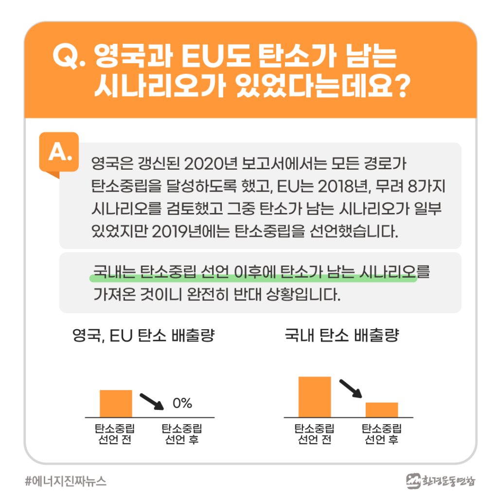 A. 영국은 갱신된 2020년 보고서에서는 모든 경로가 탄소중립을 달성하도록 했고, EU는 2018년, 무려 8가지 시나리오를 검토했고 그중 탄소가 남는 시나리오가 일부 있었지만 2019년에는 탄소중립을 선언했습니다.