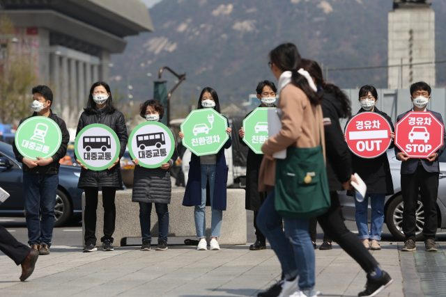 4월 11일 오전 환경운동연합 회원들은 서울 세종대로 주변에서 경유차 퇴출과 친환경 대중교통 활성화를 촉구하는 ‘미세먼지 줄이기 행동 캠페인’을 진행했다.ⓒ환경운동연합