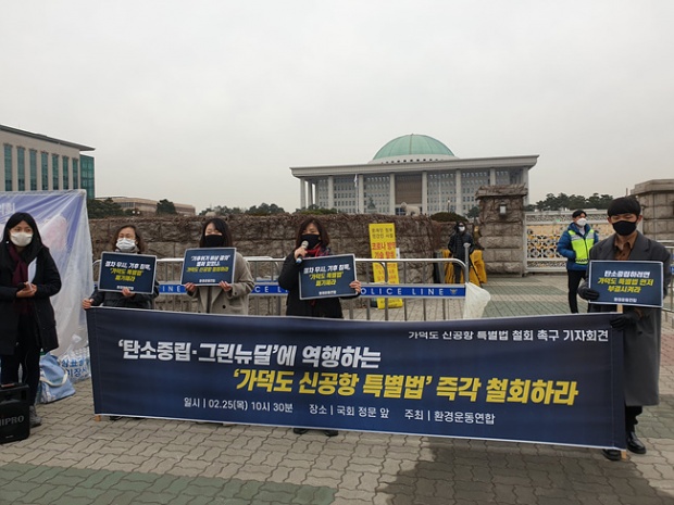 지난 2월 25일 국회 앞에서 환경연합 활동가들이 가덕도 신공항 특별법 철회 촉구 기자회견을 열었다 Ⓒ환경운동연합