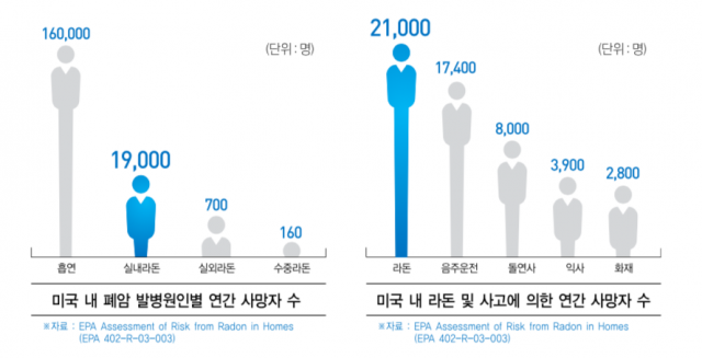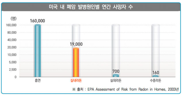 국내 연구 결과도 유사하다. 한국원자력안전기술원과 한국환경정책평가연구원에서 라돈에 의한 폐암 발생 위험도를 연구한 결과, 전체 폐암 환자 중 라돈 노출로 인한 경우를 12퍼센트로 추정했다.