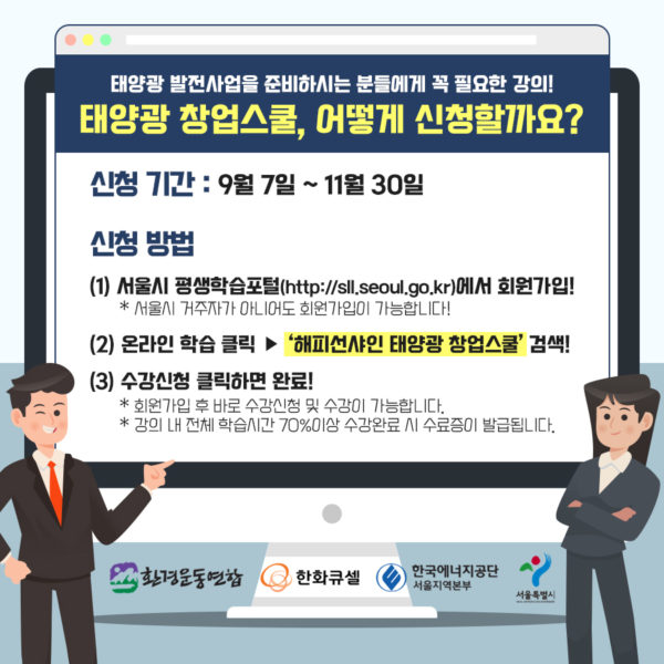 지금 서울시평생학습포털(http://sll.seoul.go.kr)에서 #해피선샤인태양광창업스쿨 검색하고 수강신청 GO GO!