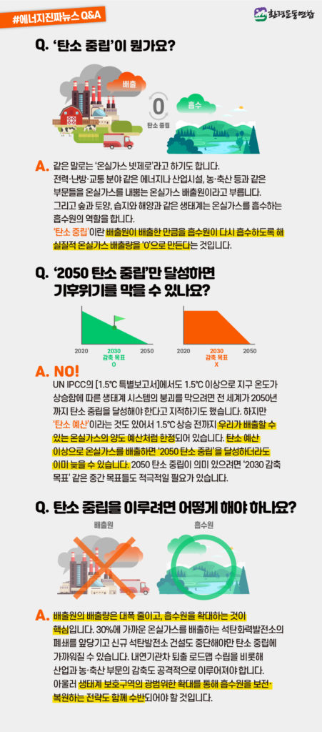 A. 같은 말로는 ‘온실가스 넷제로’라고 하기도 합니다. 전력난방·교통 분야 같은 에너지나 산업시설, 농·축산 등과 같은 부문들을 온실가스 내뿜는 온실가스 배출원이라고 부릅니다. 그리고 숲과 토양, 습지와 해양과 같은 생태계는 온실가스를 흡수하는 흡수원의 역할을 합니다. ‘탄소 중립’이란 배출원이 배출한 만큼을 흡수원이 다시 흡수하도록 해 실질적 온실가스 배출량을 ‘0’으로 만든다는 것입니다.
