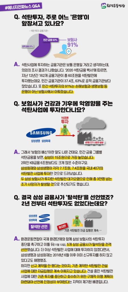 A. 환경운동연합이 국제 환경단체와 함께 삼성 보험사의 석탄투자 중단을 촉구하고 이틀 뒤인 11월 13일 5개 삼성 금융사가 탈석탄을 전격 선언했습니다. 더 이상 석탄발전 사업에 대해 투자하지 않겠다면서, 삼성생명과 삼성화재는 2018년 6월 이후 이미 신규투자를 하지 않고 있다고도 해명했죠. 하지만 신규 계약을 안 했다는 것이지, 기존 계약한 석탄발전 건설 사업에 대한 자금집행은 계속 이뤄지고 있습니다. 건설 중인 석탄발전 사업에 대한 기존 투자를 중단하고 회수하기 위한 구체적 이행 계획이 마련돼야 선언에 진정성이 부여된다는 지적이 제기된 배경입니다.