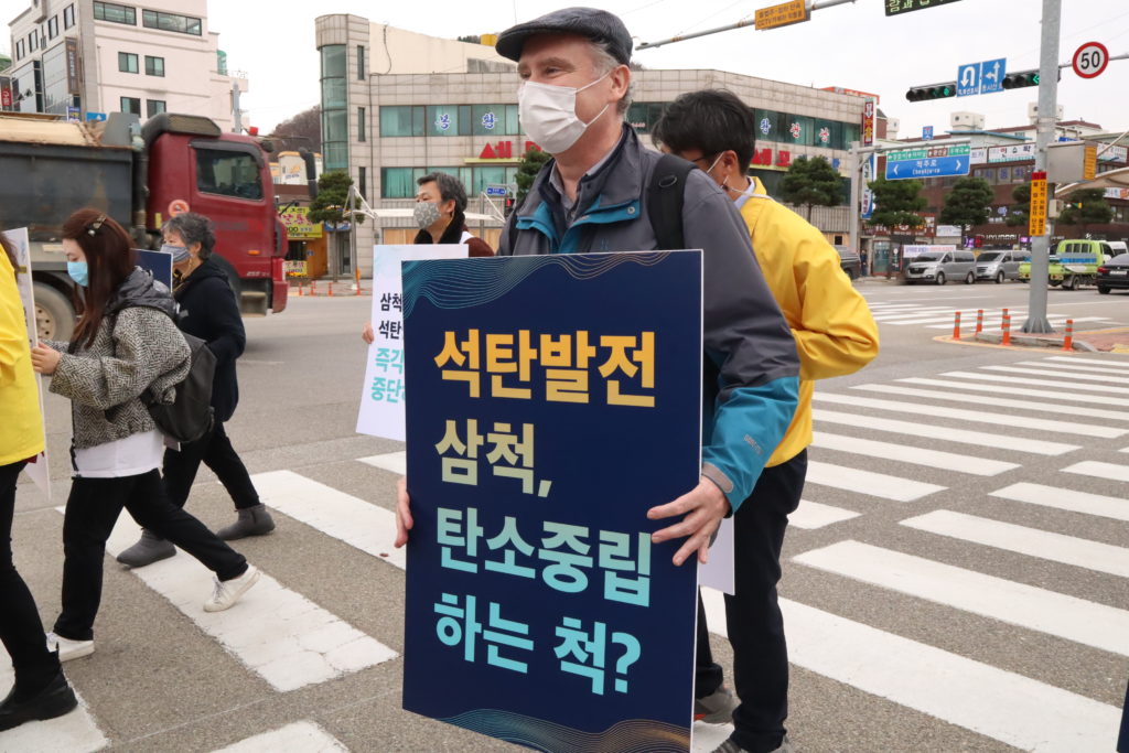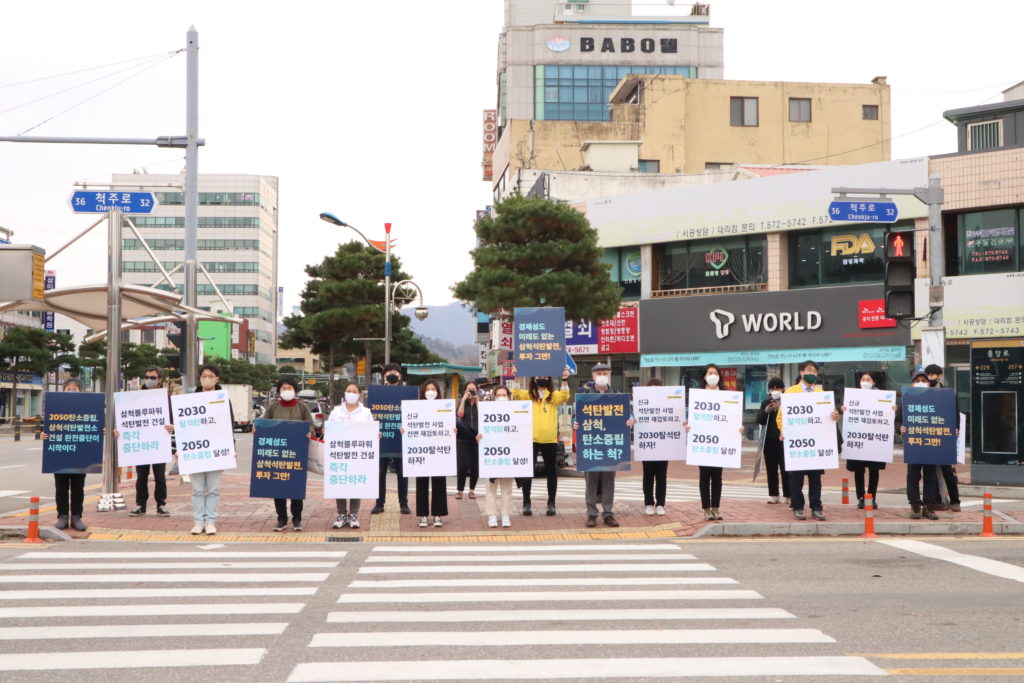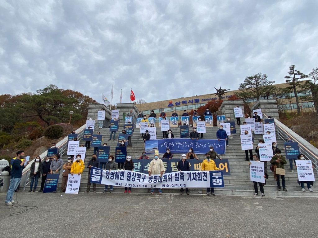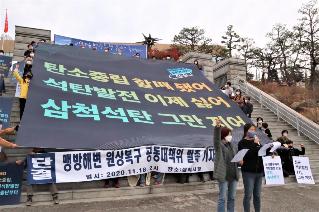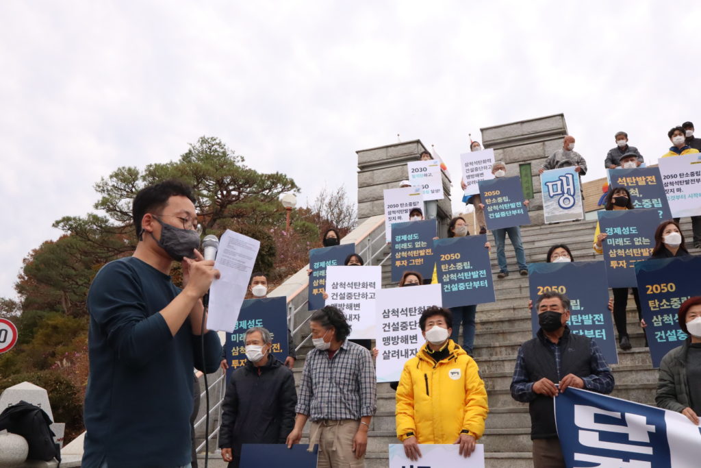 기후솔루션, 녹색연합, 환경운동연합, 한국사회책임투자포럼 등 24개 단체로 구성된 전국 탈석탄 공동캠페인 ‘석탄을 넘어서’ 및 기후위기대응을 위한 시민사회단체 연대기구 ‘기후위기비상행동’을 대표하여 전국에서 모인 시민들과, 삼척 주민들로 구성된 ‘맹방해변원상복구공동대책위원회’ 등은 당일 강원도 삼척시청앞에서 기자회견을 열고 “대규모 석탄발전소를 7기나 건설하는 와중에, 이에 대한 철회 계획없이 2050 탄소중립 달성을 이야기하는 건 말장난에 지나지 않는다”며 강하게 비판했다.