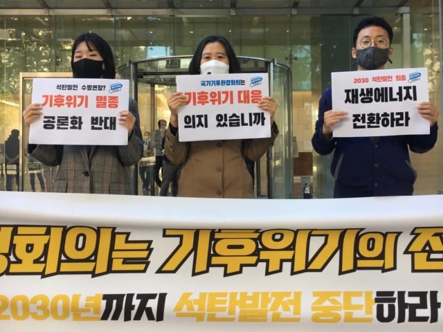 우리는 대기오염과 기후 문제 대응을 위해 석탄발전 퇴출 시점을 전향적으로 앞당기기 위해 애써야 마땅한 국가기후환경회의가 파리협정의 1.5도 목표 달성은 물론 국민의 눈높이와도 한참 동떨어진 정책을 준비하고 있다는 소식에 분노하며 국가기후환경회의가 이러한 입장을 재검토할 것을 요구한다.