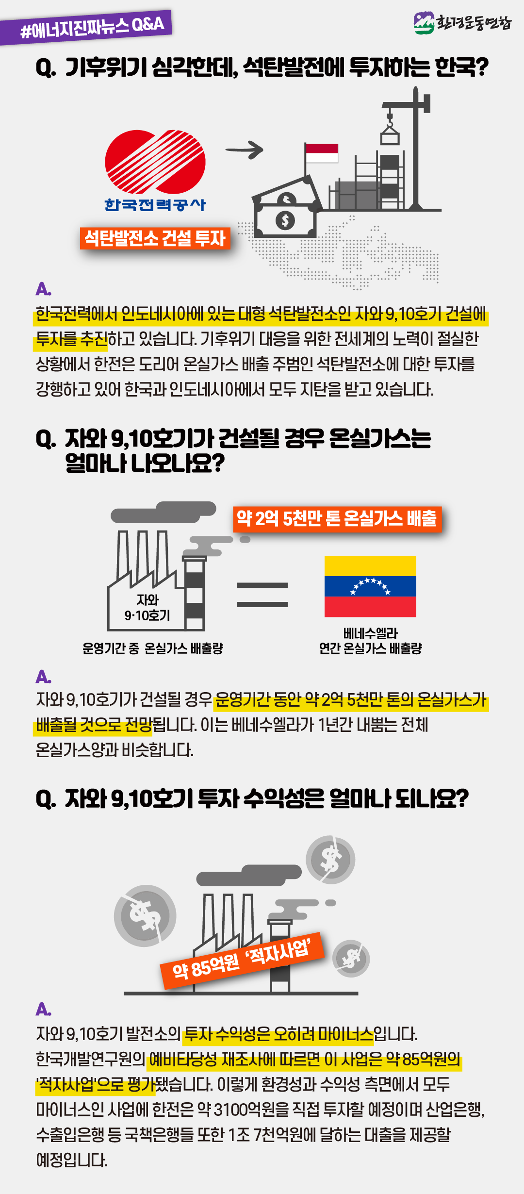 한국전력에서 인도네시아에 있는 대형 석탄발전소인 자와 9,10호기 건설에 투자를 추진하고 있습니다. 기후위기 대응을 위한 전세계의 노력이 절실한 상황에서 한전은 도리어 온실가스 배출 주범인 석탄발전소에 대한 투자를 강행하고 있어 한국과 인도네시아에서 모두 지탄을 받고 있습니다.