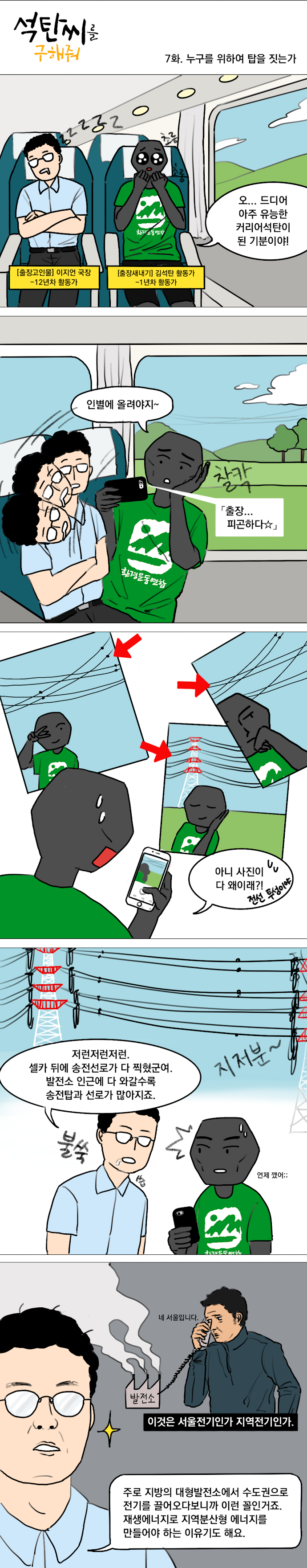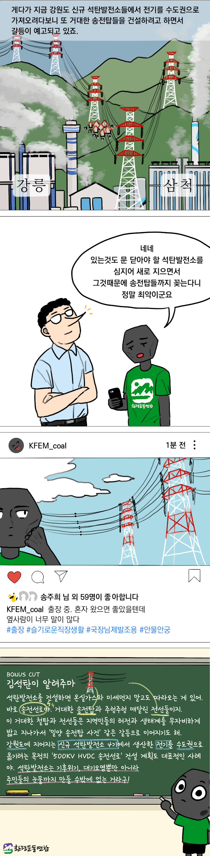 <김석탄이 알려주마>석탄발전소를 건설하면 온실가스와 미세먼지 말고도 따라오는 게 있어. 바로 송전선로야. 거대한 송전탑과 주렁주렁 매달린 전선들이지. 이 거대한 철탑과 전선들은 지역민들의 터전과 생태계를 무자비하게 밟고 지나가서 ‘밀양 송전탑 사건’ 같은 갈등으로 이어지기도 해. 강원도에 지어지는 신규 석탄발전소 4기에서 생산한 전기를 수도권으로 옮기려는 목적의 ‘500KV HVDC 송전선로’ 건설 계획도 대표적인 사례야. 석탄발전소는 기후위기, 대기오염뿐만 아니라 주민들의 눈물까지 만들 수밖에 없는 거라구!