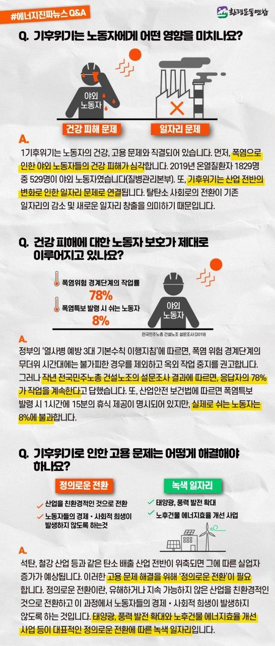 기후위기는 노동자의 건강, 고용 문제와 직결되어 있습니다. 먼저, 폭염으로 인한 야외 노동자들의 건강 피해가 심각합니다. 2019년 온열질환자 1829명 중 529명이 야외 노동자였습니다(질병관리본부). 또, 기후위기는 산업 전반의 변화로 인한 일자리 문제로 연결됩니다. 탈탄소 사회로의 전환이 기존 일자리의 감소 및 새로운 일자리 창출을 의미하기 때문입니다.
