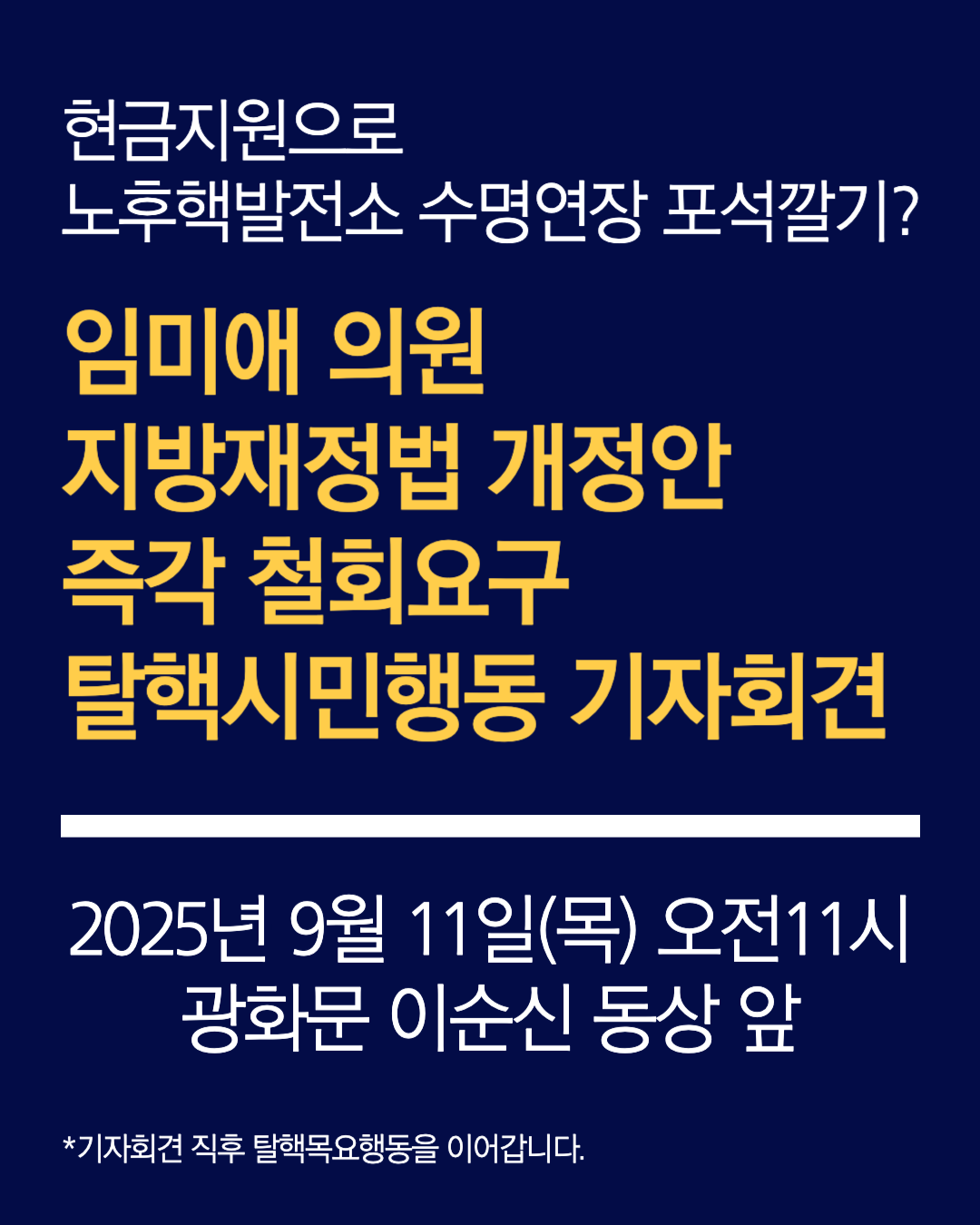 탈핵시민행동은 임미애 의원의 법안개정을 즉각 철회하고, 핵발전소 수명연장과 신규건설 추진에 대한 명확한 입장을 먼저 밝히길 요구하는 기자회견을 엽니다. 많은 분들의 관심과 참석을 부탁드립니다