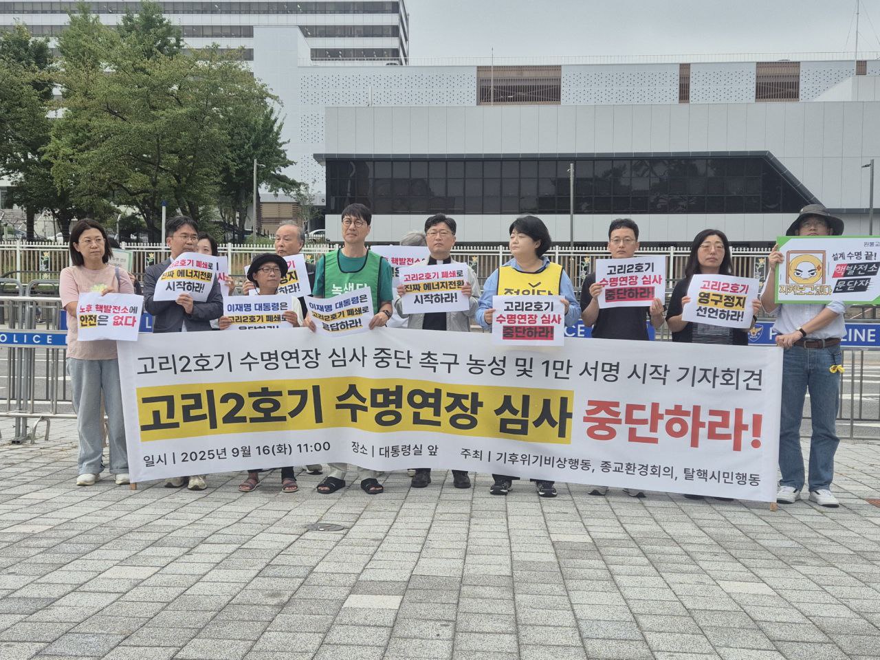 기후, 종교, 탈핵, 환경 단위는 16일(화) 오전 11시 용산 대통령집무실 앞에서 고리2호기 수명연장 심사중단을 요구하는 1만인 서명과 농성시작을 알리는 기자회견을 열었다. 윤석열 정부와 함께 시작된 노후원전 수명연장 심사는 순차적으로 진행되고 있으며, 원자력안전위원회는 곧 고리2호기 수명연장 여부를 결정하는 심사를 진행할 예정이다. 고리2호기는 1970년대 상업운전을 시작한 노후원전으로, 지난 2023년 4월 8일 수명을 만료하고 가동중지되었다.