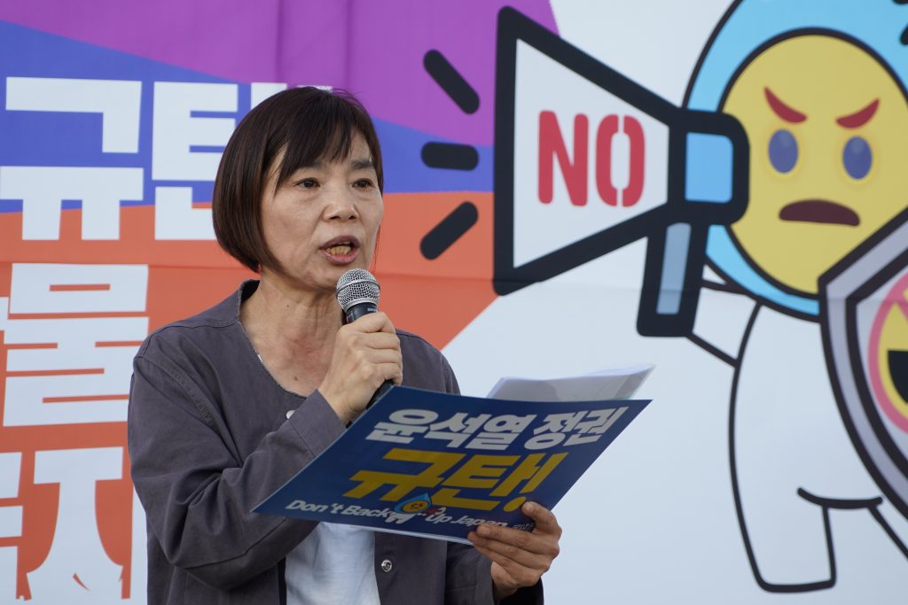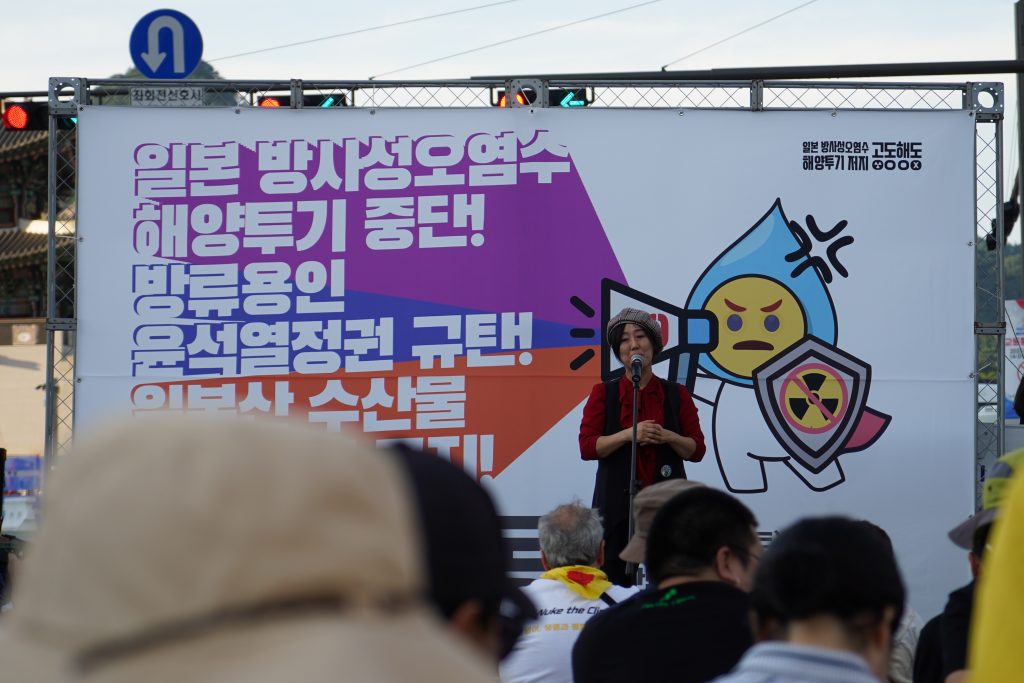 - 박석운 한국진보연대상임대표는 “일본정부와 도쿄전력, 그리고 IAEA가 합작한 국제사기극, 미국의 바이든 정부가 뒷배를 봐주고 윤석열 정부가 앞잡이 역할을 하는 국제사기극이 지금도 계속되고 있다. 이는 과학이 아니라 과학과 진실에 배치되는 반과학적 사기술에 불과하다.”라고 말하며 일본의 해양투기와 이를 용인하는 IAEA, 한국, 미국을 비판했다. 또한, 핵오염수 해양투기는 런던해양법협약/런던의정서에 위반되는, 인류와 해양생태계에 대한 저강도 핵테러와 다름없는 범죄행위라고 말했다. 그리고 8월 24일 일본의 해양투기 이후 한달동안 힘차게 투쟁한 결과 국제적 반대운동이 확산되고 있음을 밝히며, 추석 이후에도 더욱 힘차게 싸움을 이어가자고 말하며 발언을 마무리했다.