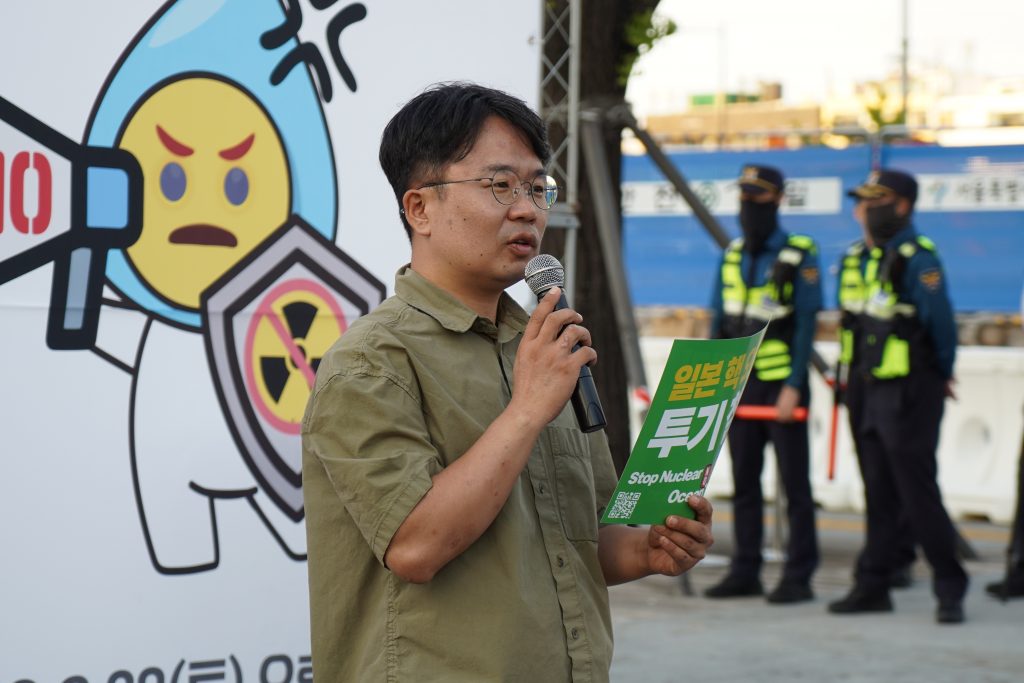 - 김춘이 환경운동연합 사무총장은 “후쿠시마(핵발전소 사고)는 IAEA 사고 평가 척도 0-7 등급 가운데 체르노빌 사고와 함께 가장 위험하다는 7등급을 받았다. 게다가 후쿠시마 사고로 일본은 아직도 원자력 긴급 사태 선언이 발령중이다. 또한, 핵 연료봉이 녹아내린 후쿠시마 원전의 폐로는 30~40년 안에 불가능하다. 1979년의 스리마일 원전 사고는 후쿠시마 사고에 비하면 약과지만 아직도 폐로가 진행 중이다. 몇 십년으로는 불가능한 폐로를 가능한 것처럼 보이려고 핵 폐수를 바다에 버리고 있다.”라고 오염수 해양투기를 감행하고 있는 일본 정부를 강하게 비판했다.