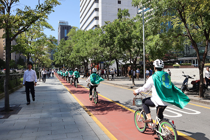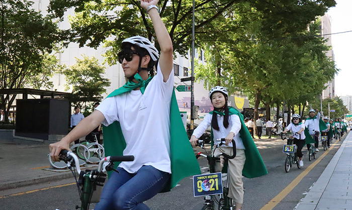 청계천에 나타난 초록슈퍼맨들이 기후위기를 알리며 흥겨운 자전거 라이딩을 펼쳤습니다.