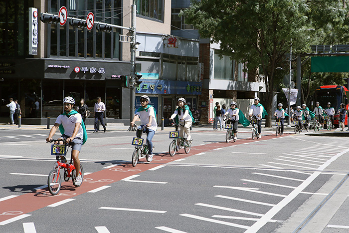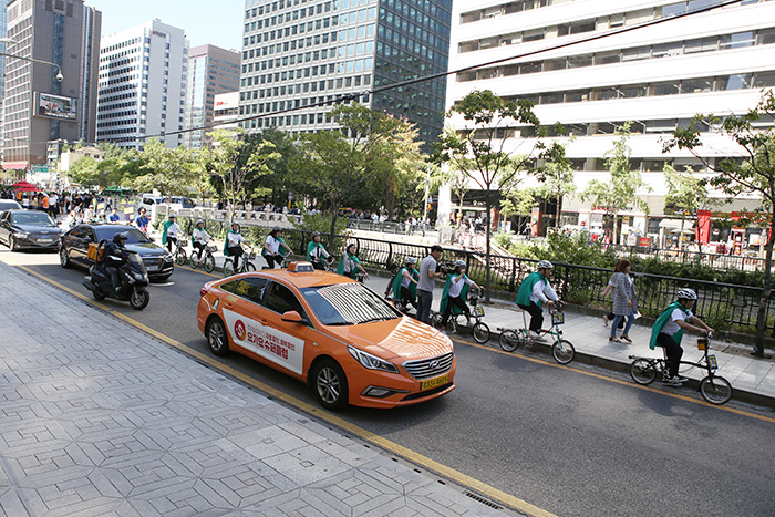 9월 18일 12시, 환경운동연합 회원들이 청계천에 모여 함께 자전거와 인력거를 타고 달렸습니다.