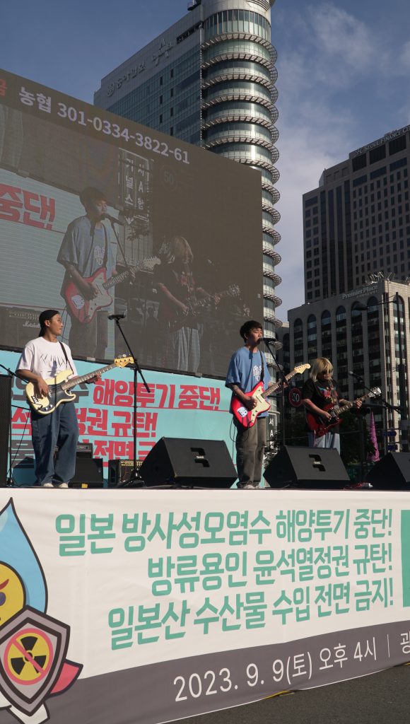 이날 공연을 맡은 밴드 ‘로큰롤 라디오’와 가수 ‘이수진’씨는 참여한 시민들의 열기를 북돋았다. 마지막으로 더불어민주당 박광온 원내대표, 정의당 배진교 원내대표, 기본소득당 오준호 공동대표, 진보당 이상규 전상임대표가 정당을 대표해 발언한 뒤 대표단을 선두로 행진을 이어갔다. 이날 참석한 시민들은 종로와 을지로, 세종대로를 행진하면서, 일본 핵오염수 해양투기 문제에 공감하는 시민들의 박수와 환호를 받았고, 이순신동상 앞에서 박석운 일본방사성오염수해양투기저지공동행동 공동대표의 마무리 발언으로 행사를 마무리했다.