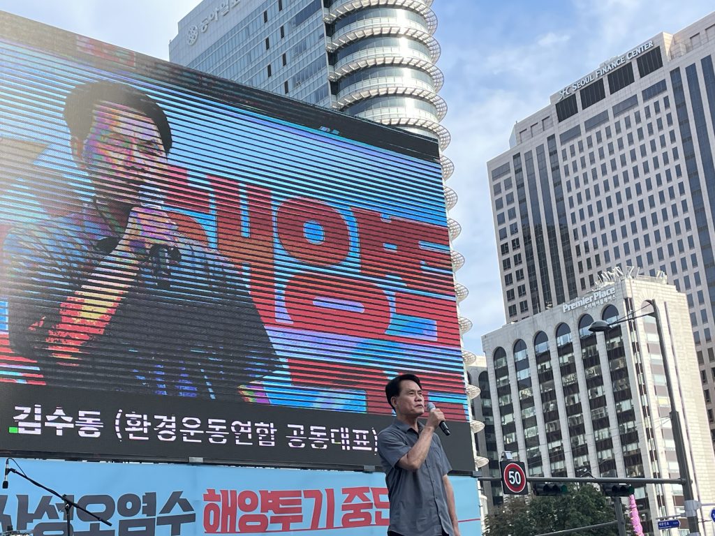 강새봄 진보대학생넷 대표가 사회를 맡아 진행한 이날 행사에서, 김수동 환경운동연합 공동대표는 “이제 하다하다 안되니 국민적 불안과 생존권을 지키기 위한 우리의 몸부림을 낡아빠진 북한 타령으로 돌리고 있다”면서, “후쿠시마 핵오염수를 바다에 버리는 것에 대해 불안하고 위험하다고 하는 국민들을 괴담 선동자로 낙인찍고 무지몽매한 반국가 세력”으로 모는 정부의 행태를 규탄했다.