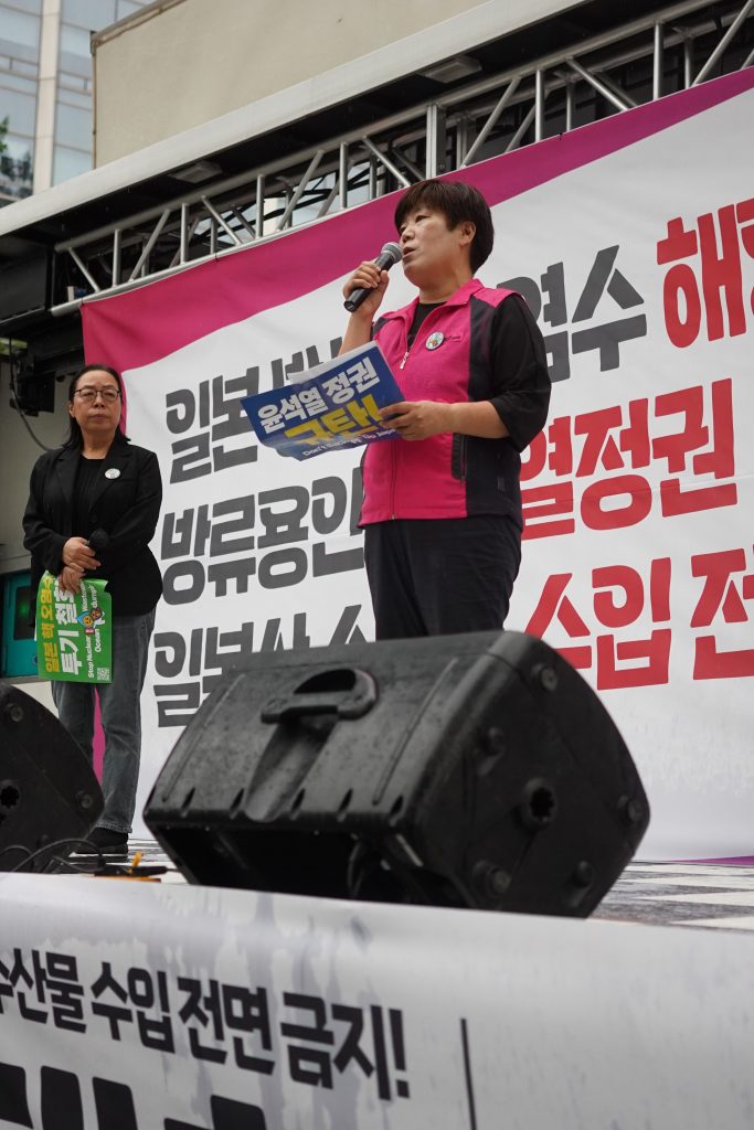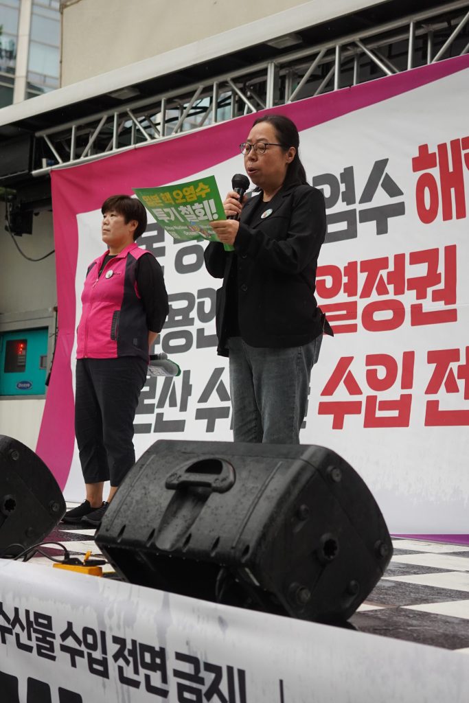 21년째 초등학교 급식실에서 아이들의 밥을 짓고 있는 고혜경 전국학교비정규직노조 인천지부 정치통일위원장은 “학교 급식실에서 매일 아침 가장 중요한 일은 식재료 검수”지만 이제 매일 방사능 오염 검사도 할 판이라고 지적했다. 일본을 두둔하고, 괴담 유포로 협박하는 대통령의 행위는 “친환경 무상급식 정책에 대한 포기이며 자라나는 학생들의 건강과 안전을 포기하는 정책”이라며 국민을 지켜야 할 헌법상의 책무를 내버렸다고 비판했다.