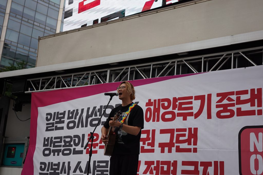 다음으로 가수 ‘송희태’씨가 오염수 투기 중단을 위해 힘찬 노래를 부르고, 시민 발언이 이어졌다.