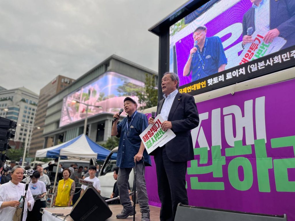 이어 4차 전국행동의 날을 위해 일본에서 방문한 핫토리 료이치 일본사회민주당 간사장의 발언이 이어졌다. 그는 ‘해양투기를 막아내겠다. 함께 싸워가자’라고 구호를 외쳤다. ‘일본정부, 도쿄전력은 관계자 이해 없이 오염수를 처리하지 않겠다고 약속했다. 관계자는 한국 국민이 아니겠냐.’며 ‘바다는 일본과 한국시민 공동의 귀중한 재산이다. 일본 정부 마음대로 해양투기하는 것을 인정할 수 없다.’고 비판했다. 이어 ‘IAEA는 일본 어민과 시민의 반대 목소리를 무시하며 거짓말쟁이인 도쿄전력 목소리만 듣고 있다. 이를 어떻게 믿겠냐? 바다를 핵쓰레기장으로 만들어서는 안된다. 우리 생명과 안전을 위해 한국과 일본 시민이 함께 연대하며 싸워나가자’고 밝혔다.