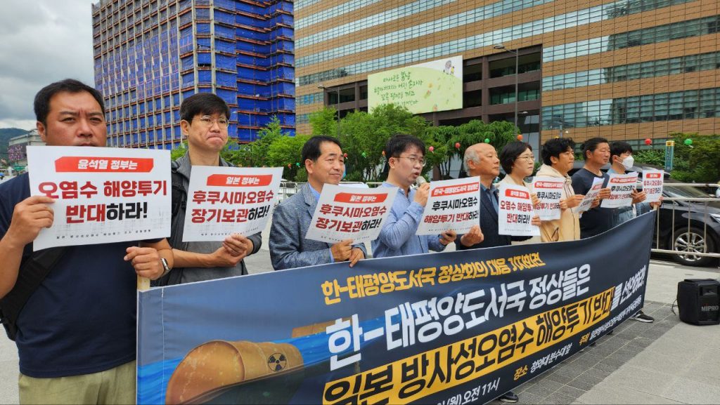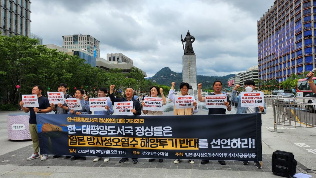 ‘일본 방사성 오염수 해양투기 저지 공동행동’(이하 공동행동)은 29일 오전 11시 광화문 이순신 동상 앞에서 기자회견을 열고 “한-태평양도서국 정상들은 일본 방사성 오염수 해양 투기를 반대하라”고 촉구했다. 이 자리에서 공동행동은 ▲한-태평양도서국 정상들의 오염수 해양투기 반대 선언 ▲일본 방사성 오염수 해양투기 즉각 중단을 요구했다.