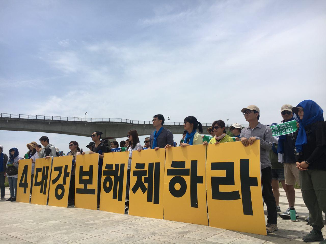 환경운동연합을 비롯한 4대강재자연화시민위원회와 한국환경회의 등은 경기도 여주시 금사면 외평리에 놓인 이포보에 모였다. 이들은 “4대강 흐르게”, “4대강 보 해체하라”는 대형 현수막을 준비해 구호를 외쳤다.Ⓒ4대강재자연화시민위원회