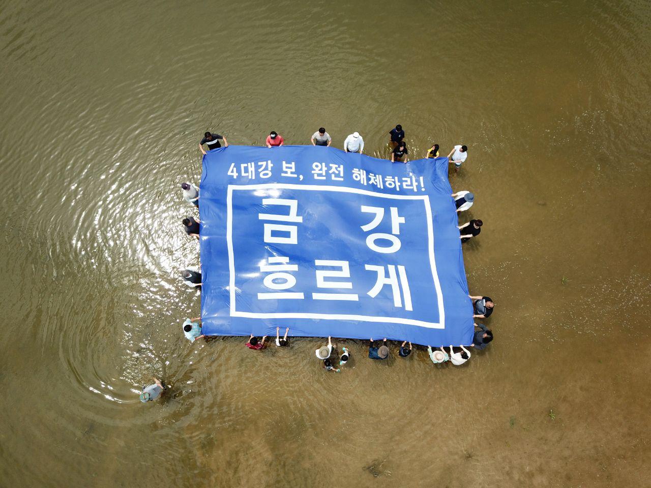 금강유역의 5개 광역시도의 49개 시민·환경 단체들로 구성된 ‘금강유역환경회의’는 이날 오전 이곳 모래톱에서 금강의 보 처리방안 이행을 촉구하는 기자회견을 열었다. 이후 참가자들은 강물에 들어가 ‘4대강 보, 완전 해체하라! 금강 흐르게’라고 쓰인 파란색의 대형 펼침막을 들어보였다.
