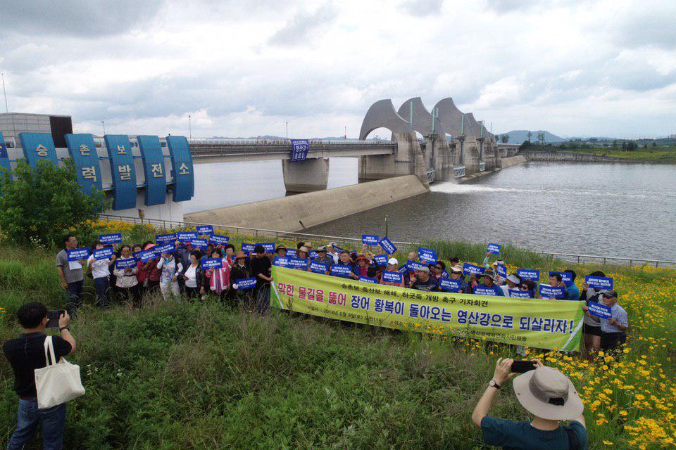 광주·전남지역 20여 시민단체로 구성된 ‘영산강재자연화시민행동’도 같은 날 영산강 승촌보 앞에서 담양, 광주, 나주, 화순, 함평, 영암, 목포 등 지역민 등 200여 명이 참석한 가운데 기자회견을 진행했다. 참가자들은 승촌보 상단 다리 난간에 ‘영산강 흐르게’라는 대형 현수막을 내걸고 ‘장어와 홍복이 돌아오는 영산강’, ‘죽산보·승촌보 해체’ 등 구호를 새긴 손팻말을 흔들었다.