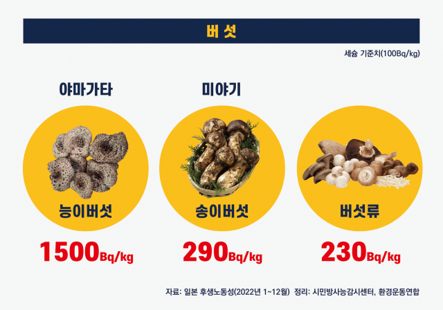 - -2022년 10월 도쿄신문이 발표한 후쿠시마 현 이바타무라 지역의 방사능 검사결과 버섯에서 최대 64,889Bq/kg이 검출되었고, 송이버섯에서는 식품 기준치(100Bq/kg)의 100배가 넘는 방사성 물질들이 검출됨.