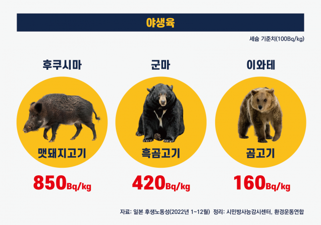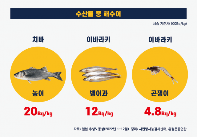 - -해수어의 경우 2022년 후쿠시마에선 한 건도 세슘이 검출된 이력이 없음. 후쿠시마를 제외한 미야기, 치바, 이바라키, 이와테, 아오모리 산 해수어의 검출이 늘어남.