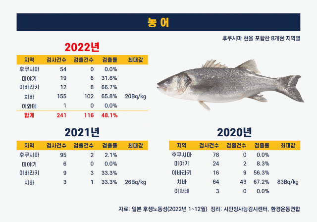 수산물은 전년보다 검출률이 상승하며, 세슘이 검출된 해수어의 종류가 늘어났다. 주목해야 할 것은 수산물 검사에서 후쿠시마현을 제외한 인근 현에서 잡힌 수산물에서의 검출 건수가 늘어난 것이다. 세슘이 최대 20베크렐 검출된 농어의 경우 241건 중 116건이 검출되었다. 다만 오히려 후쿠시마산 농어에서는 세슘이 검출되지 않았는데, 이는 후쿠시마에서 잡은 해수어의 검사가 제대로 이뤄지지 않고 있거나 후쿠시마 오염수에 포함된 방사성 물질이 예상과 달리 후쿠시마 원전에서 먼바다에 영향을 미치고 있다는 것이라고 예측할 수 있다.