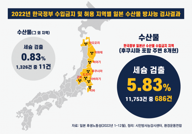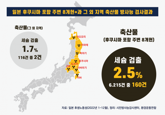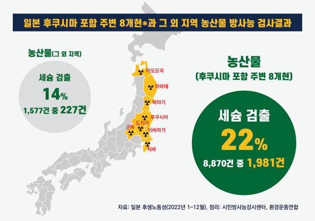 2023년 4월 5일 시민방사능감시센터와 환경운동연합은 2022년의 후생노동성 식품에서의 방사성 물질 검사결과를 분석하여 <일본산 농수축산물 방사능 오염 실태 분석 보고서>를 발표했다.