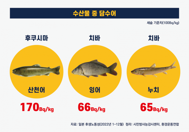 - -일본 현지 수산물 가운데 방사성물질 세슘 검출이 높게 나타난 품목은 산천어에서 170Bq/kg이 검출되었고, 곤들메기, 산천어, 잉어, 브라운 송어 등 민물고기에서 주로 세슘이 검출됨.