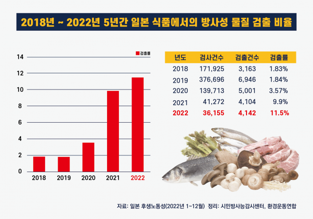 일본 정부가 일본산 식품에서의 방사성 물질이 잘 관리되고 있고, 안전한 상태라고 주장하고 있으나 실상은 그와 달랐다. 일본산 식품 분석 보고서 발표를 시작한 2018년부터 2022년까지 5년간의 방사성 물질 검출률을 보면 검출률이 급증하고 있다.