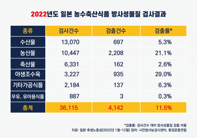 일본 정부는 2022년도에 총 36,115건의 농수축산 식품을 대상으로 방사성 물질 세슘에 대한 검사를 진행하여 발표하였다. 방사성 물질 검사 건수는 줄어들었지만, 검출률은 오히려 증가 추세를 보이고 있어 일본산 농수축산물의 방사성 물질 오염이 심각함을 보여주고 있다.