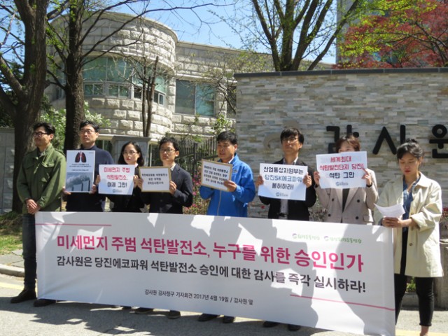 2017년 4월 19일 환경운동연합은 서울 종로구 감사원 앞에서 ‘미세먼지 주범 신규 석탄발전소 승인 강행에 대한 감사원 감사청구’ 기자회견을 열고 감사청구서를 제출했습니다. 환경운동연합은 이날 기자회견을 통해 산업통상자원부의 당진에코파워 석탄발전소 승인을 철회할 것을 요구했습니다.