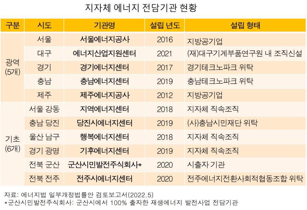 2012년 제주에너지공사가 출범한 이후 지역 주도의 에너지전환을 실행할 전담기관인 에너지센터 또는 에너지공사는 광역 5개, 기초 6개가 설립됐습니다(2021년 4월 기준). 이런 전담기관은 지역에너지계획 수립을 지원하고 에너지전환 관련 주민참여와 소통을 강화하는 역할을 맡습니다.