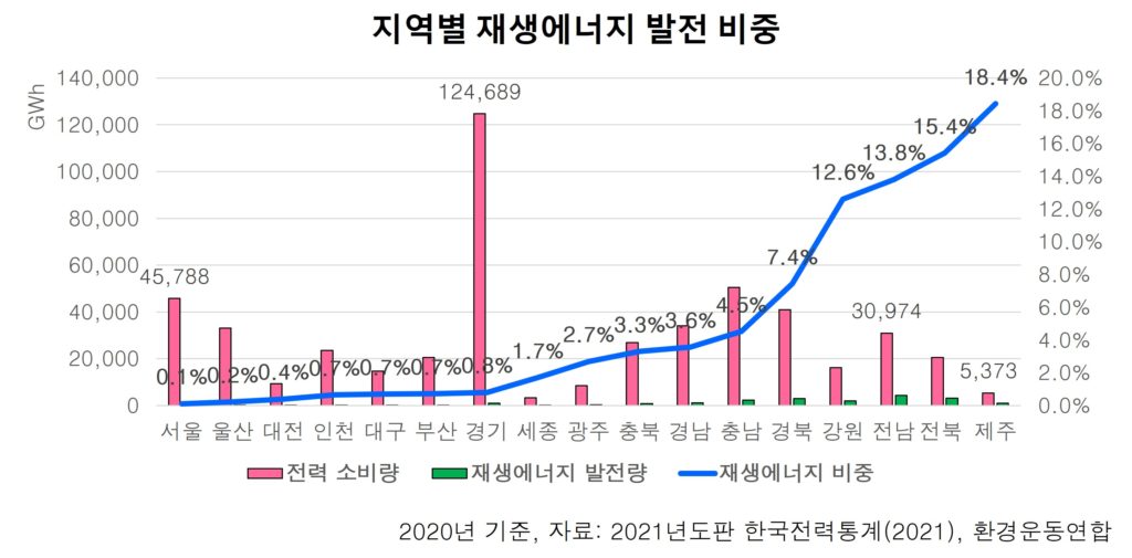 하지만 2020년 기준 한국의 태양광, 풍력 발전 비중은 4.7%로 G20 회원국 중 최하위 수준이고 세계 평균 10%의 절반에도 미달합니다. 국내 행정구역별 전력 소비량 대비 재생에너지(태양광, 풍력) 발전 비중이 5% 이상인 곳은 단 5곳에 불과했고, 서울 등 대도시 비중은 1% 미만으로 나타났습니다. 2020년 전력 소비량이 124,689GWh로 가장 많은 경기도의 경우, 재생에너지 비중은 0.8%에 그쳤습니다.