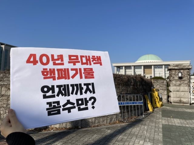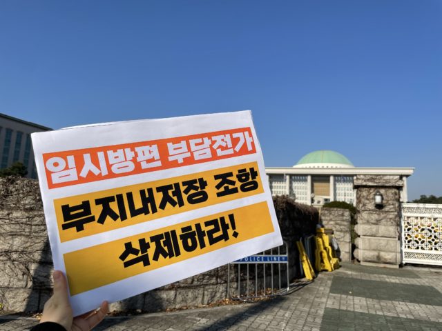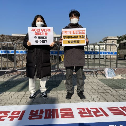 그저 핵발전을 안정적으로 가동하기 위한 고준위 특별법안 독소조항인 ‘부지 내 저장’은 반드시 삭제되어야 하고, 국회가 핵폐기물을 줄이고, 핵폐기물의 안정적 관리를 보장할 수 있는 법으로 다시 만들 것을 촉구합니다.